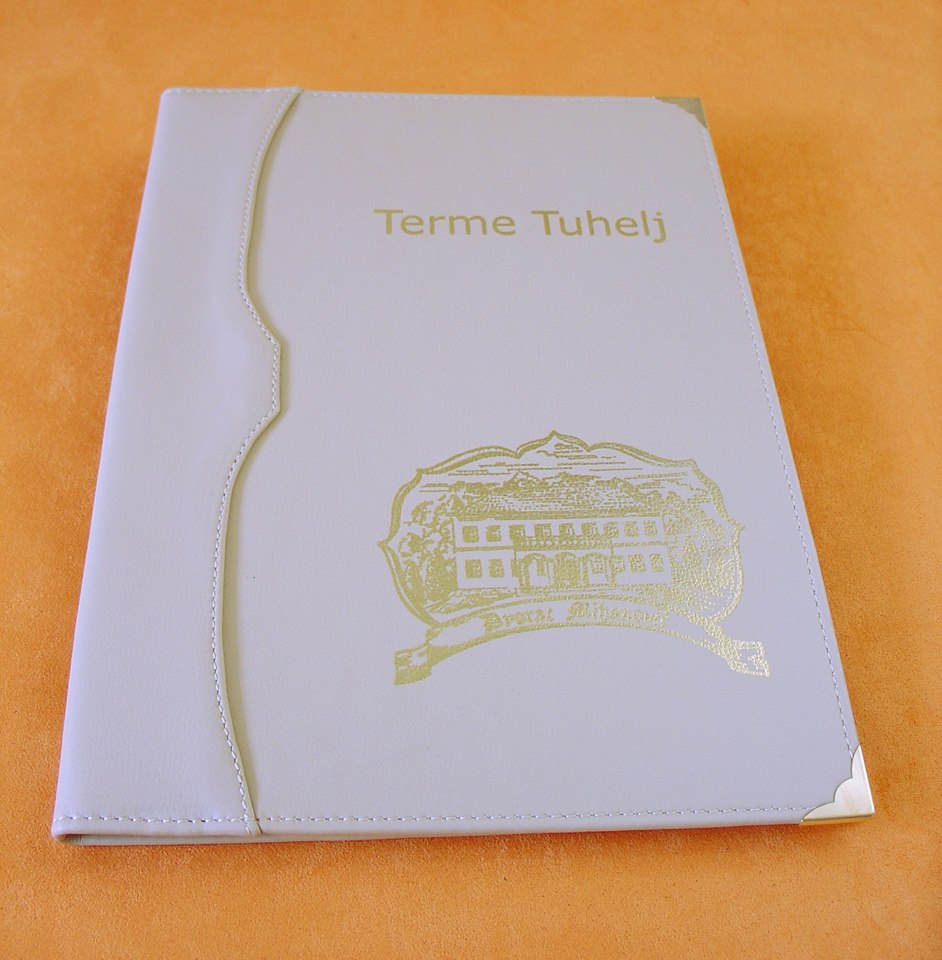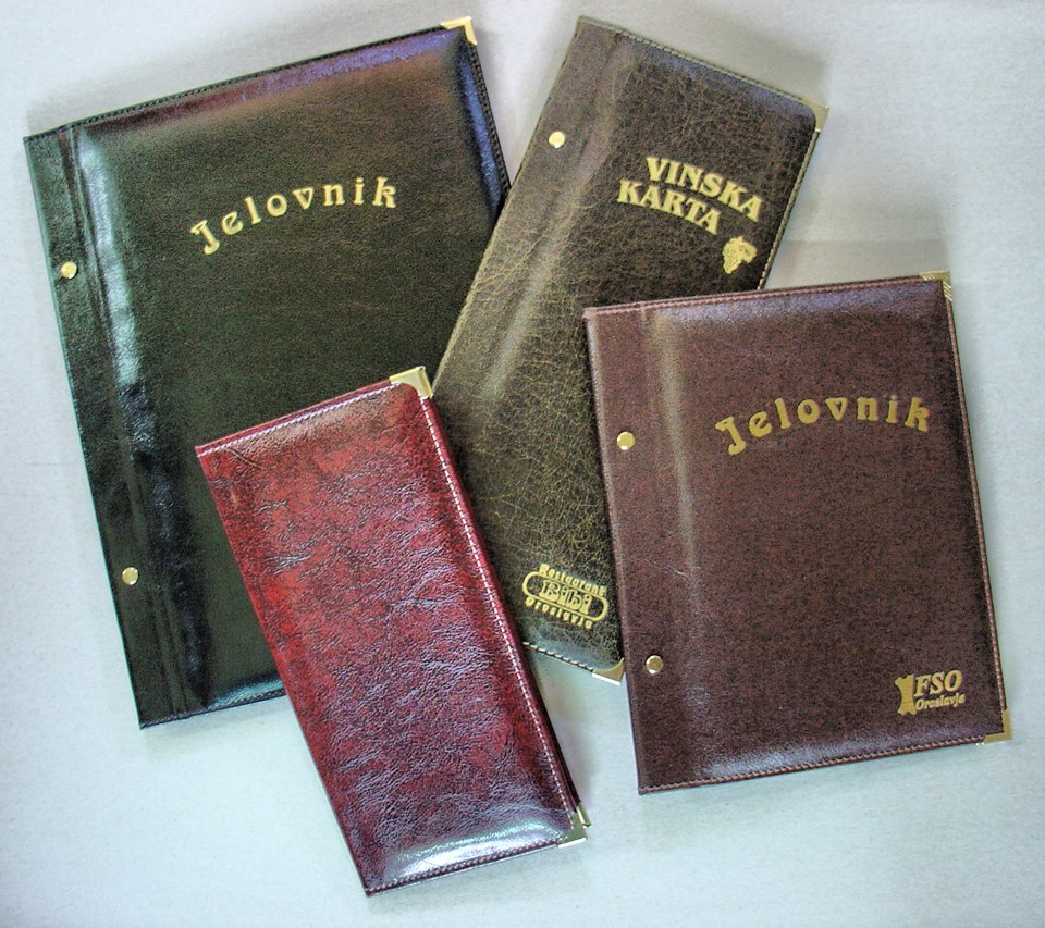 Mape i jelovnici Mape i jelovnici od prirodne kože. Jelovnik od umjetne kože Jelovnik od prirodne kože. Jelovnici od prirodna kože Korice za povelju Korice od umjetne kože